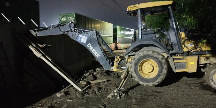 Para evitar que la barda colapsara completamente, trabajadores realizaron maniobras con barrotes e incluso con una retroexcavadora.