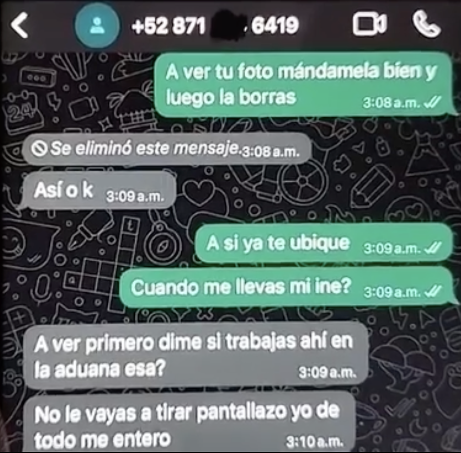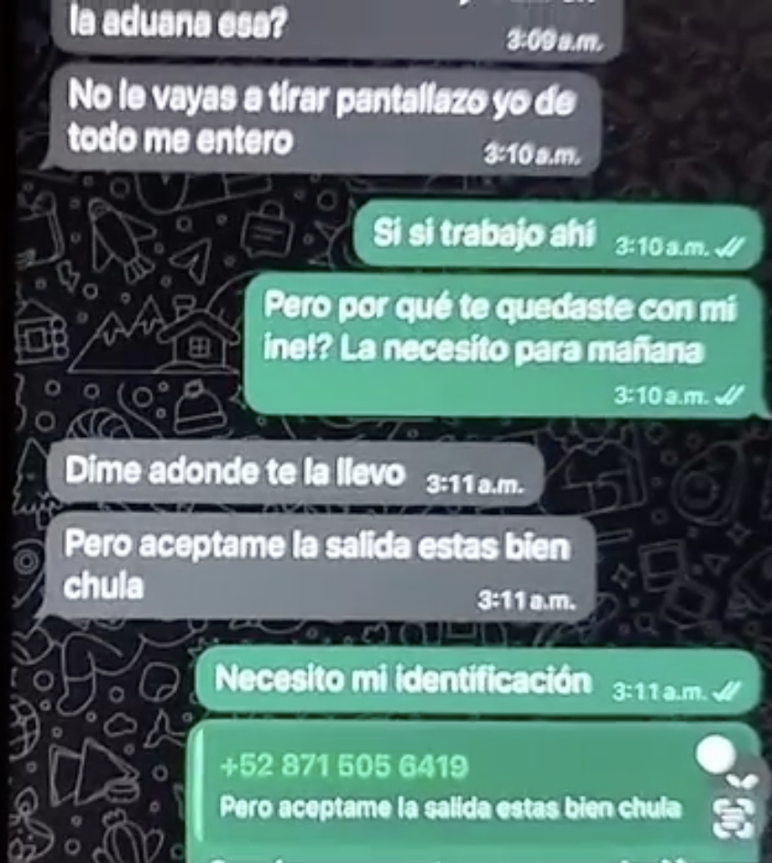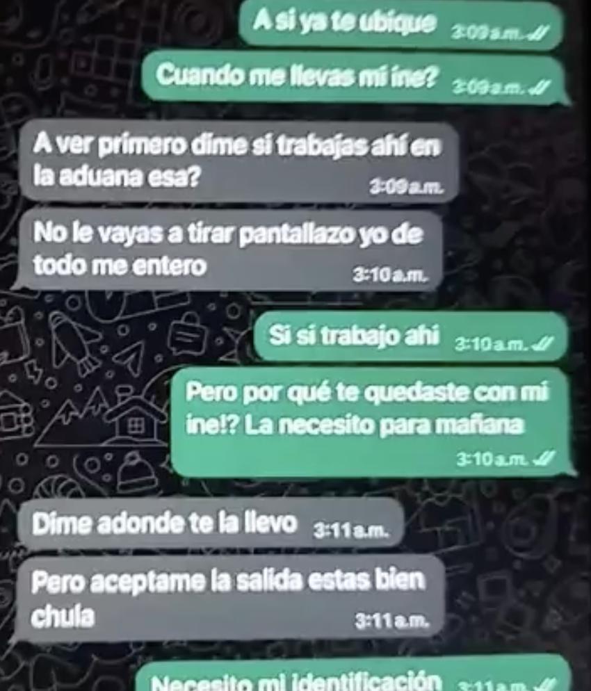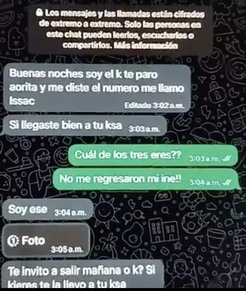 De acuerdo con lo expuesto en redes sociales, la afectada relató que el mando policiaco le retuvo de manera arbitraria su credencial de elector durante un filtro antialcohol. Posteriormente, en la madrugada, comenzó a recibir mensajes de WhatsApp en los que el agente la invitaba a salir.