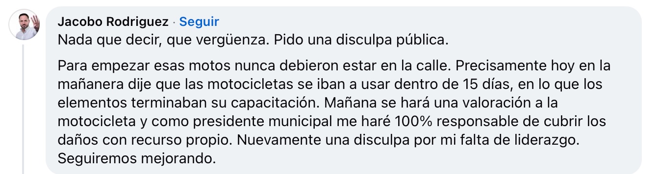 Luego de que se difundiera en redes sociales el video donde un elemento de la Policía Preventiva cae al intentar incorporarse a una rodada de motociclistas en la Gran Plaza durante el primer día de uso de nuevas unidades, el alcalde Jacobo Rodríguez reconoció públicamente su “falta de liderazgo” y ofreció una disculpa por lo ocurrido.