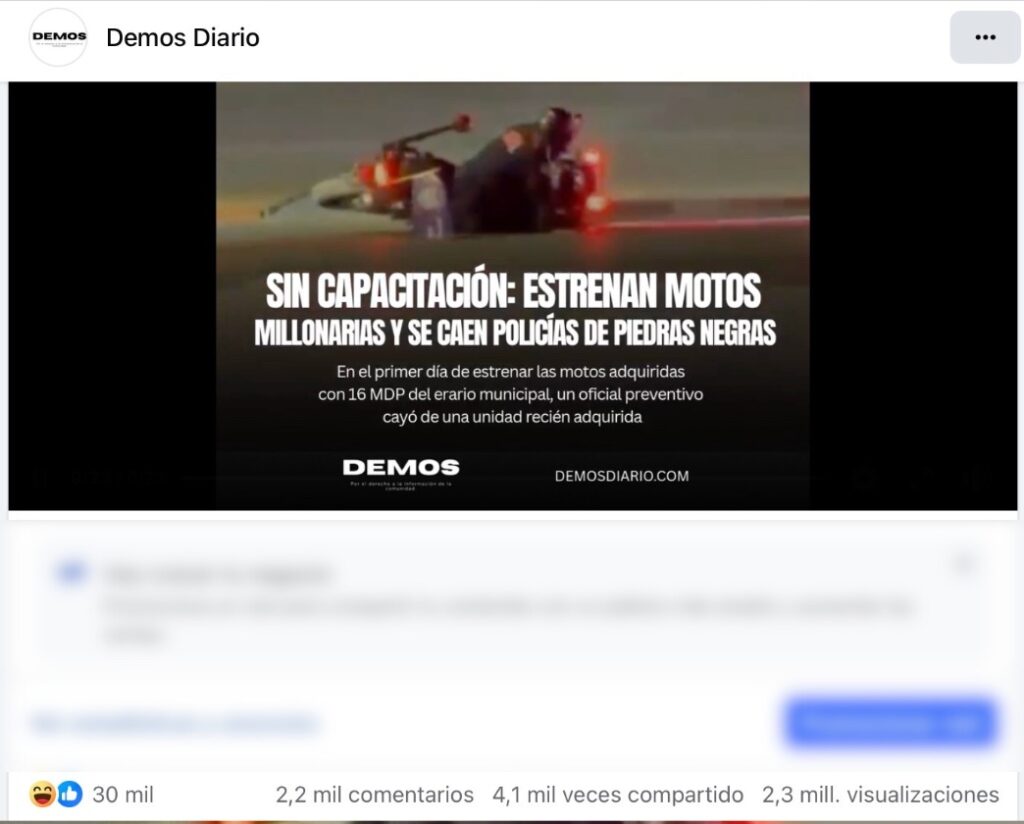 El video del momento en que el elemento pierde el control de la motocicleta fue difundido en redes sociales de Demos Diario y, hasta la mañana de este sábado, acumulaba alrededor de 30 mil reacciones, más de 2 mil comentarios, cerca de 4 mil compartidas y más de 2 millones de visualizaciones, generando una amplia conversación entre usuarios.