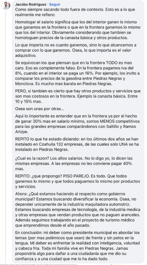 El alcalde de Piedras Negras, Jacobo Rodríguez, respondió este miércoles a la publicación relacionada con sus declaraciones sobre la homologación salarial, al asegurar que su postura fue sacada de contexto; sin embargo, en su mensaje reiteró que los salarios más altos en la frontera han sido un factor determinante para la falta de llegada de nuevas empresas.