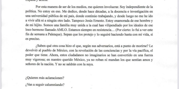 «Soy independiente de la política. No estoy en eso. Me dedico desde hace décadas a la docencia e investigación en universidad pública de mi país, donde continúo trabajando y desde luego no me he ido a vivir allá ni a ningún otro lado. Tampoco mi hijo Jesús Ernesto», afirmó la también escritora.