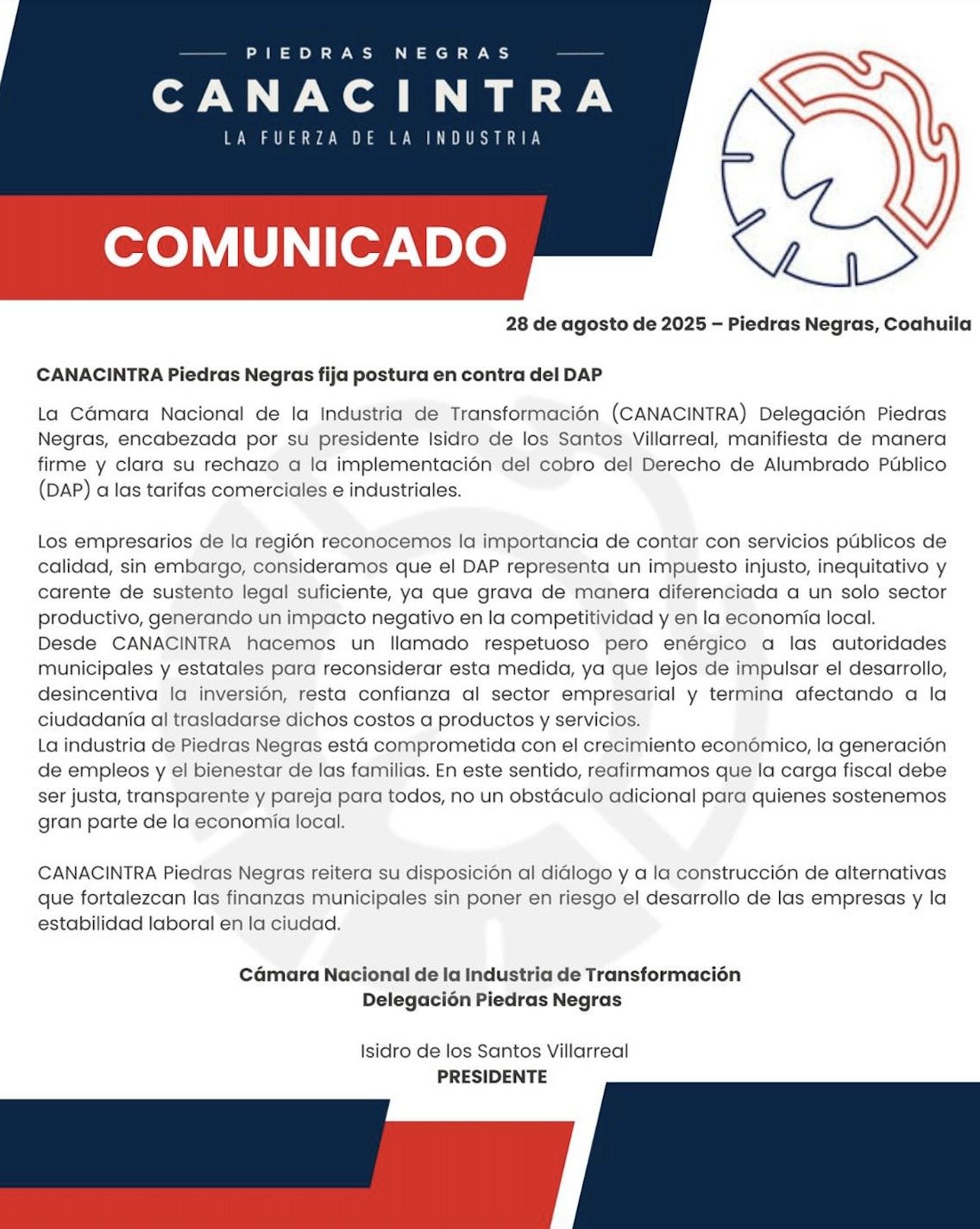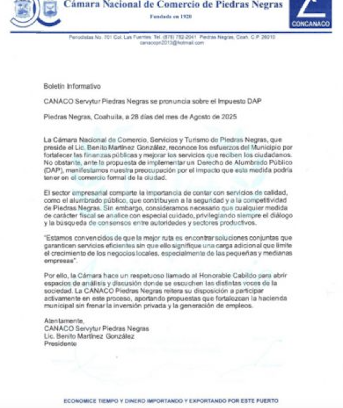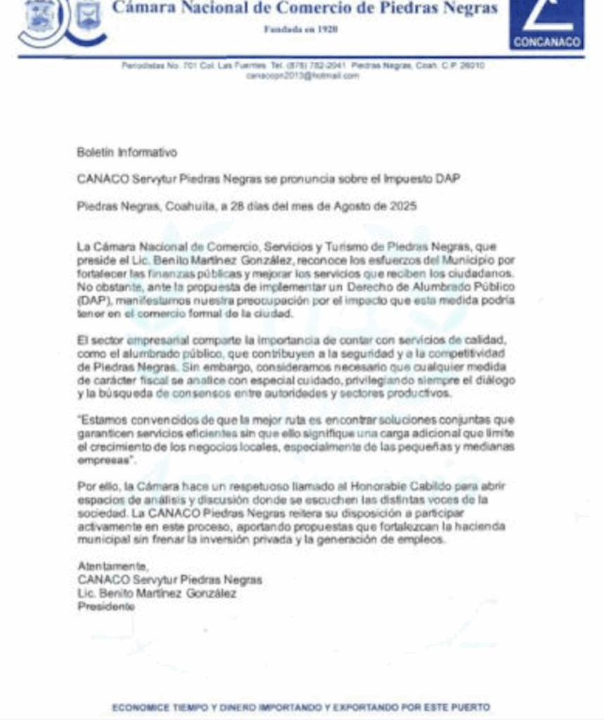 Ambos organismos coincidieron en que cualquier medida de carácter fiscal debe ser justa, transparente y resultado del consenso, no un obstáculo que frene el desarrollo económico ni ponga en riesgo la estabilidad laboral de la ciudad. Por ello, hicieron un llamado al Cabildo de Piedras Negras para abrir espacios de análisis y diálogo con los sectores productivos, reiterando su disposición a aportar propuestas que fortalezcan la hacienda municipal sin estrangular al sector privado.