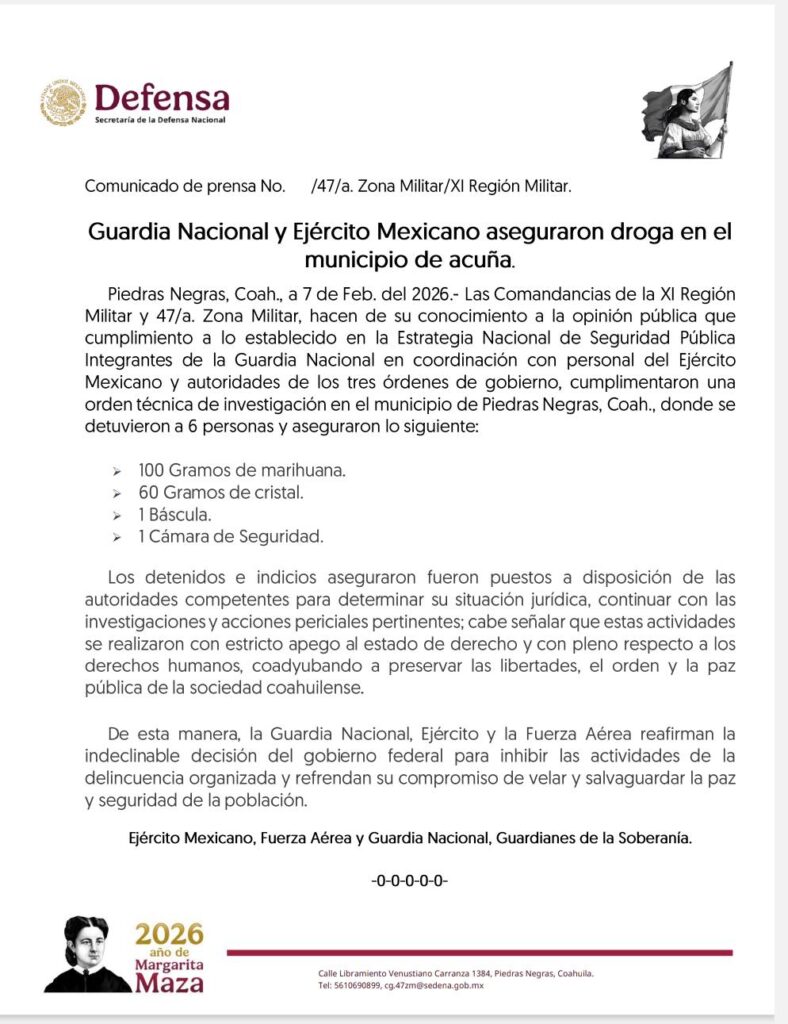 Seis personas fueron detenidas y diversos indicios asegurados durante un operativo coordinado entre la Guardia Nacional y el Ejército Mexicano en el municipio de Acuña, como parte del cumplimiento de una orden técnica de investigación.