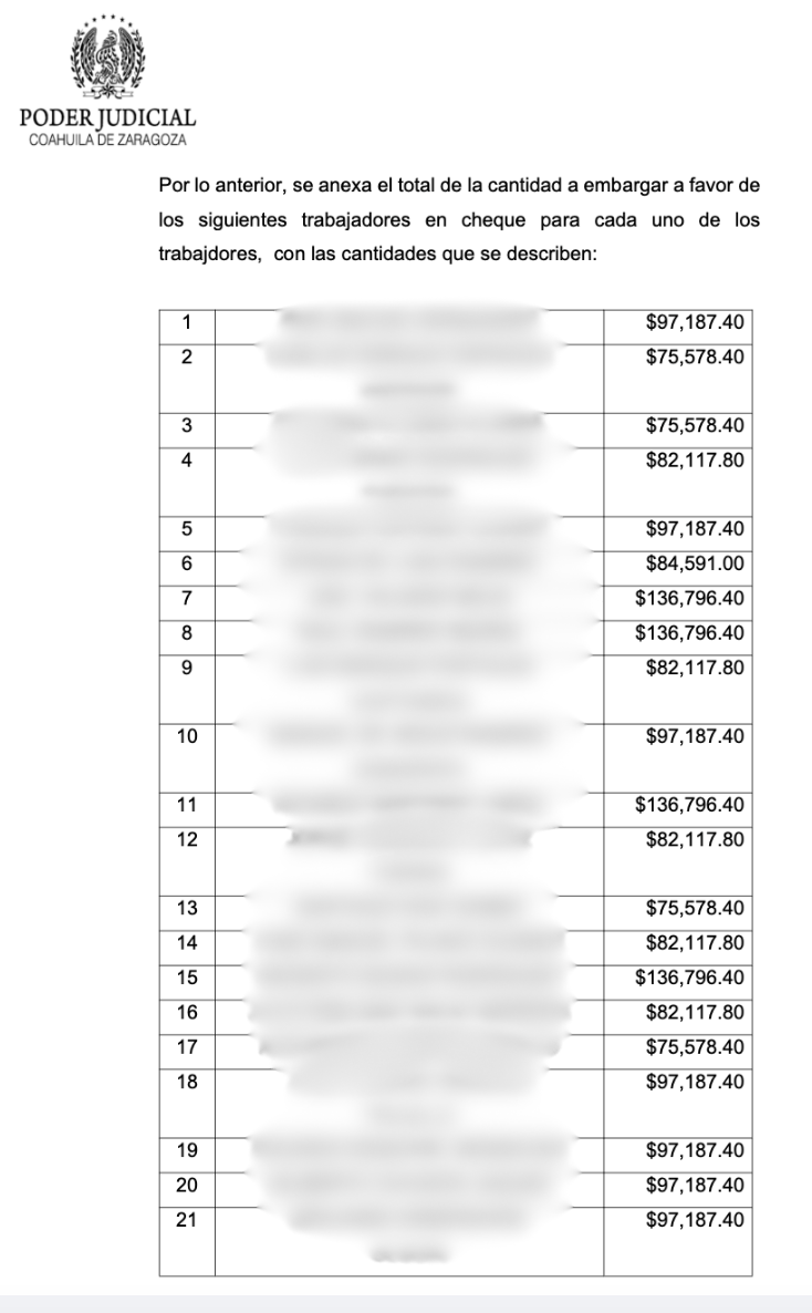 Las cantidades retenidas van de 75 mil a 136 mil pesos por trabajador, sumando más de 7.6 millones