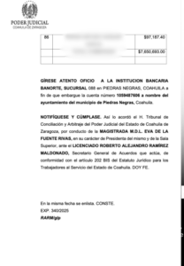 La resolución fue emitida por la Magistrada Eva de la Fuente Rivas, presidenta del Tribunal y de la Sala Superior, quien instruyó a la sucursal 088 de Banorte en Piedras Negras proceder al embargo de la citada cuenta municipal. El acuerdo fue asentado ante el secretario general de acuerdos, Roberto Alejandro Ramírez Maldonado, bajo los términos del artículo 202 Bis del Estatuto Jurídico para los Trabajadores al Servicio del Estado.