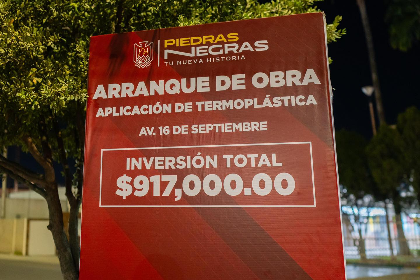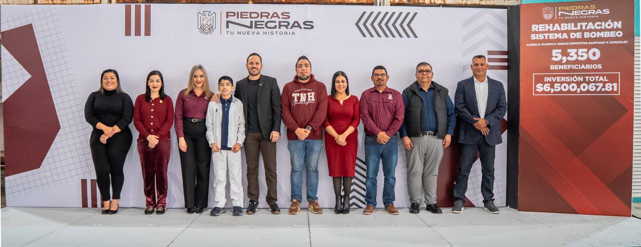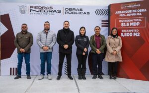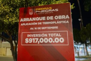 En los arranques de obra pública del municipio de Piedras Negras es común la instalación de un templete para que funcionarios municipales realicen los anuncios oficiales, acompañados de una lona colocada al fondo del escenario con información general del proyecto.