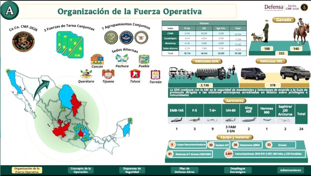 También se desplegarán dispositivos de resguardo en zonas estratégicas relacionadas con el torneo, entre ellas aeropuertos, vialidades principales, centros de hospedaje y espacios donde se concentrarán delegaciones y asistentes.