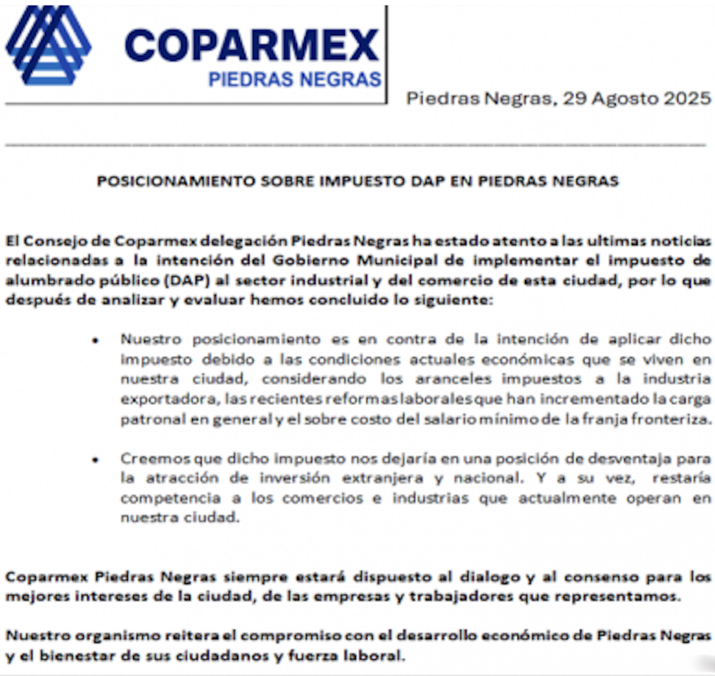 En la misma línea, Coparmex Piedras Negras difundió un comunicado donde calificó al DAP como un factor que dejaría en desventaja a la ciudad frente a otras regiones para atraer inversión. Señaló que, sumado a los aranceles a la industria exportadora, las reformas laborales y el incremento en la carga patronal, el nuevo cobro restaría competitividad a comercios e industrias locales. “Estamos en contra de la aplicación de dicho impuesto debido a las condiciones económicas actuales”, advirtió.