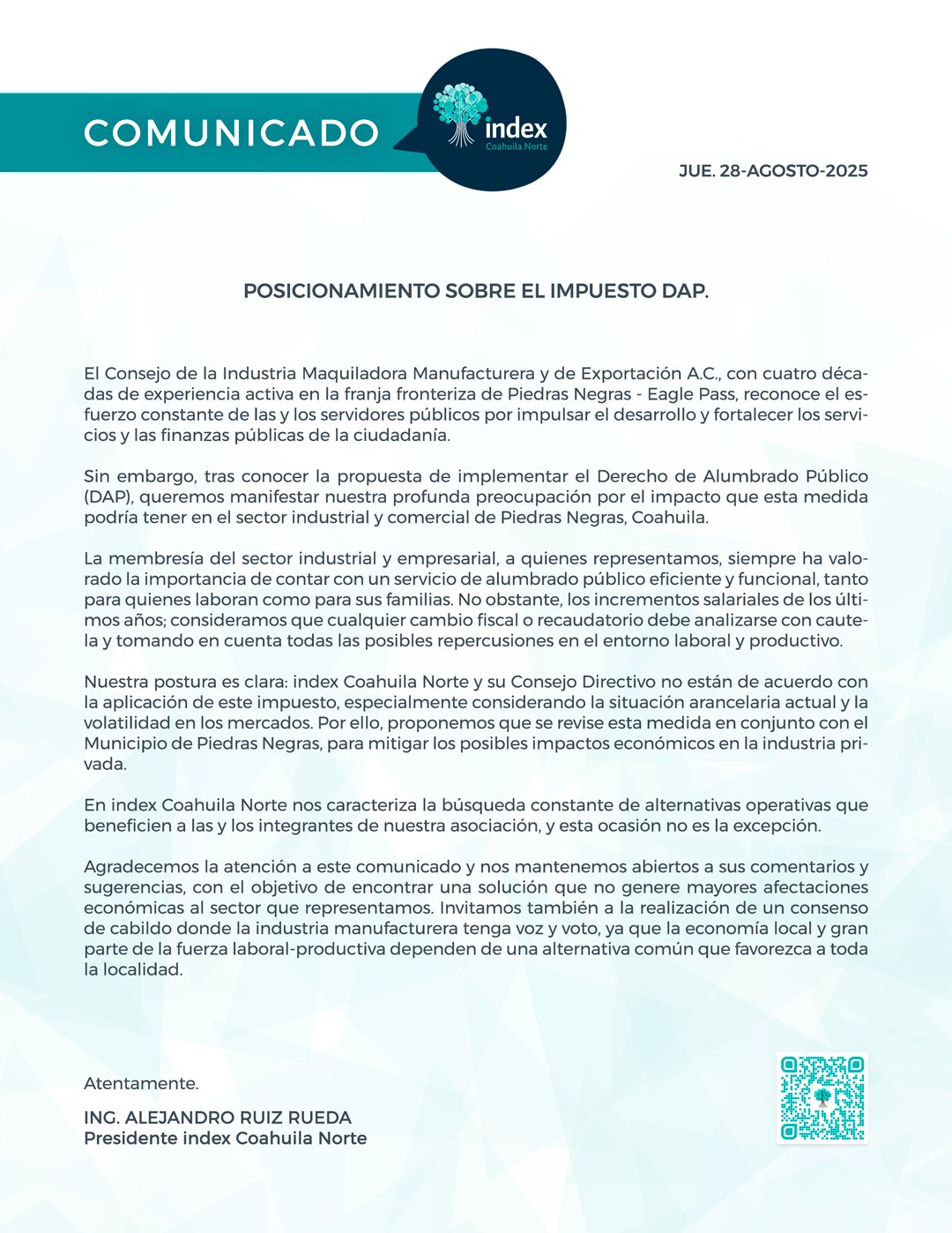 En un comunicado oficial, Index Coahuila Norte, reconoció los esfuerzos de las autoridades para fortalecer las finanzas públicas, pero expresó su “profunda preocupación” por el impacto económico que el DAP tendría en el sector industrial y comercial. “Nuestra postura es clara: no estamos de acuerdo con la aplicación de este impuesto, especialmente considerando la situación arancelaria actual y la volatilidad en los mercados”, indicó el organismo, proponiendo revisar la medida junto con el Municipio para mitigar sus efectos.