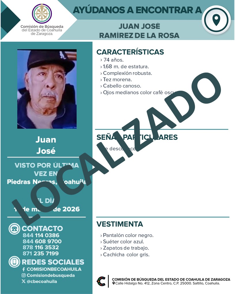 Tras alrededor de 30 horas de búsqueda, corporaciones de seguridad y rescate localizaron con vida la tarde de este jueves a Juan José Ramírez de la Rosa, de 74 años, quien había sido reportado como desaparecido luego de internarse en el monte rumbo al paraje conocido como el Pico del Águila, en Piedras Negras. El adulto mayor fue encontrado alrededor de las 2:30 de la tarde en el fondo de un barranco ubicado a unos 600 metros del bulevar Armando Treviño.