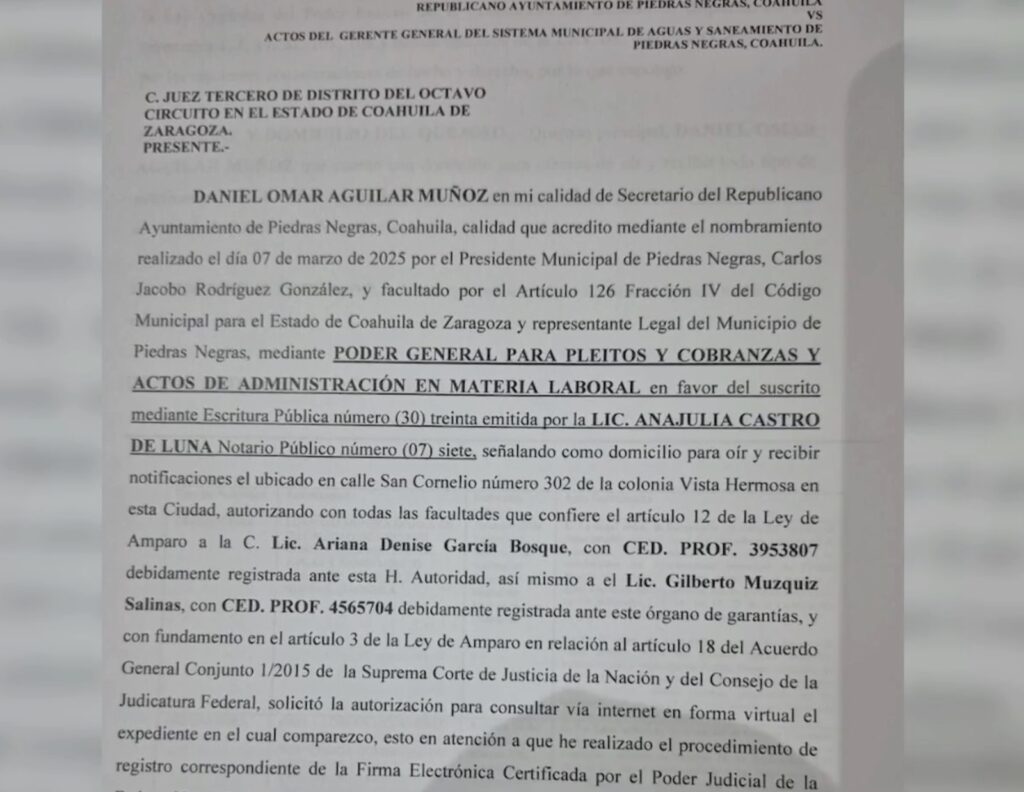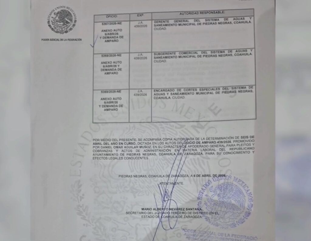 El Ayuntamiento de Piedras Negras promovió un amparo contra el cobro de más de dos millones de pesos por concepto de adeudo de agua ante SIMAS, en medio de la disputa que ambas partes mantienen desde hace meses.