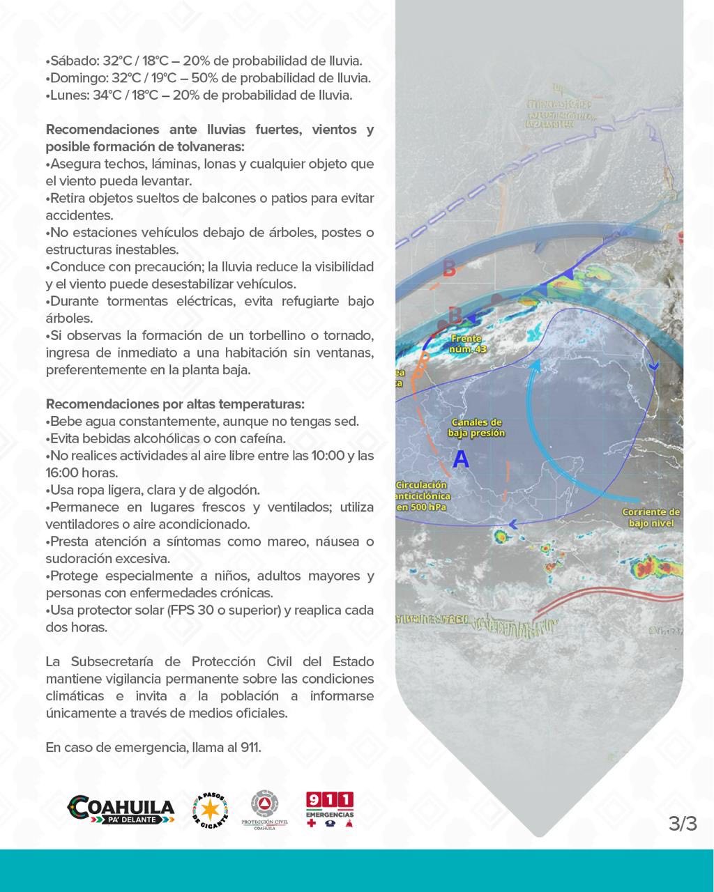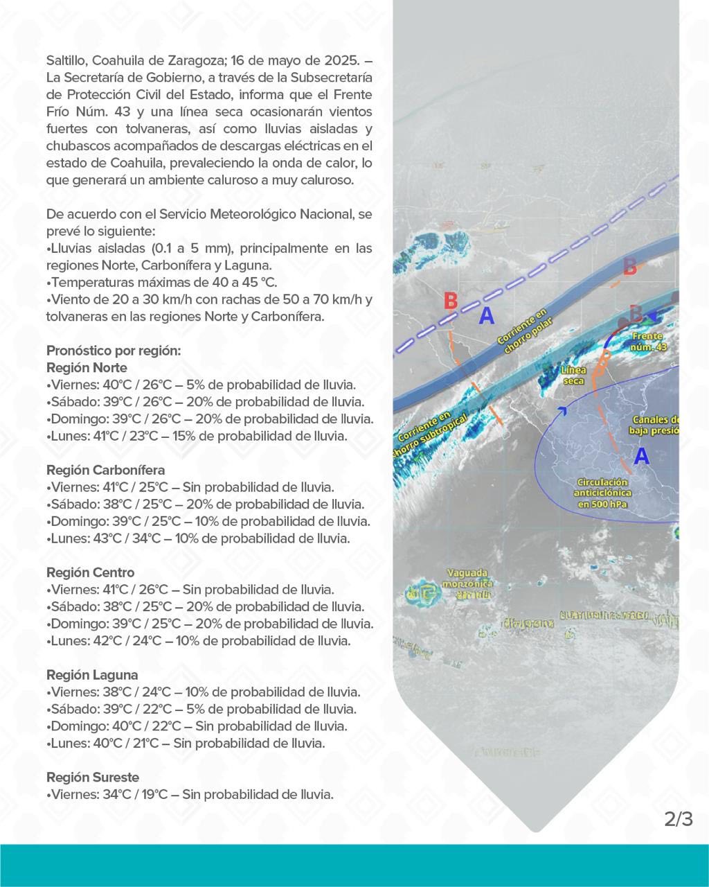 Sin embargo, Protección Civil del Estado sí emitió una alerta desde el mediodía, advirtiendo sobre rachas de viento de 50 a 70 km/h para la Región Norte y Carbonífera.