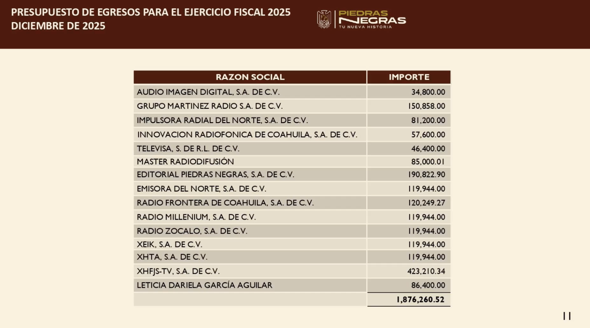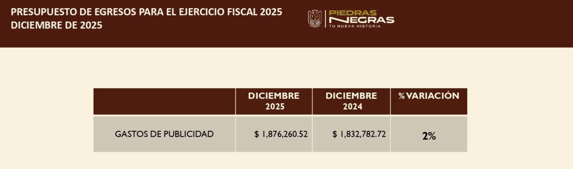 En contraste, en diciembre de 2025, ya bajo la administración de Jacobo Rodríguez, el gasto en publicidad ascendió a 1 millón 876 mil 260.52 pesos, lo que representa un incremento aproximado del 2 por ciento. A esta cifra se añadirá el monto correspondiente al convenio de publicidad con la Rancherita del Aire que el alcalde mencionó que están en camino de formalizar.