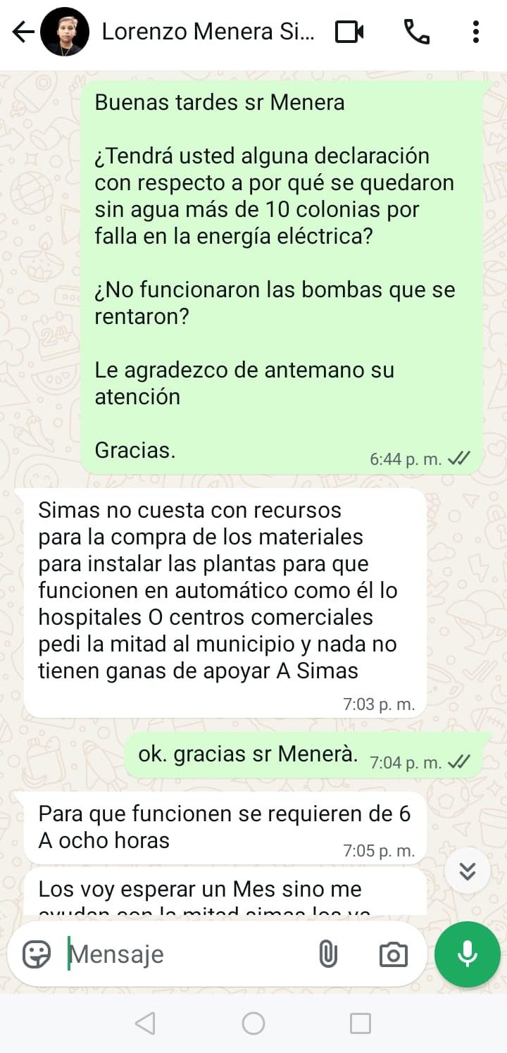 “Simas no cuenta con recursos para la compra de los materiales para instalar las plantas para que funcionen en automático como en los hospitales o centros comerciales, pedi la mitad al municipio y nada, no tienen ganas de apoyar a Simas”, puntualizó, Menera.