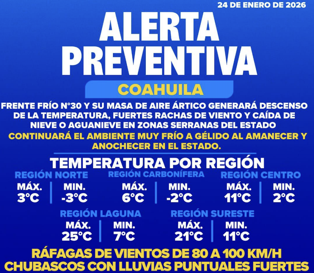 El Servicio Meteorológico Nacional (SMN), informó que este sábado 24 de enero de 2026 la tercera tormenta invernal, en interacción con los frentes fríos números 31 y 30 y una masa de aire ártico, ocasionará condiciones meteorológicas adversas en Coahuila, con lluvias, fuertes rachas de viento y descenso de la temperatura.