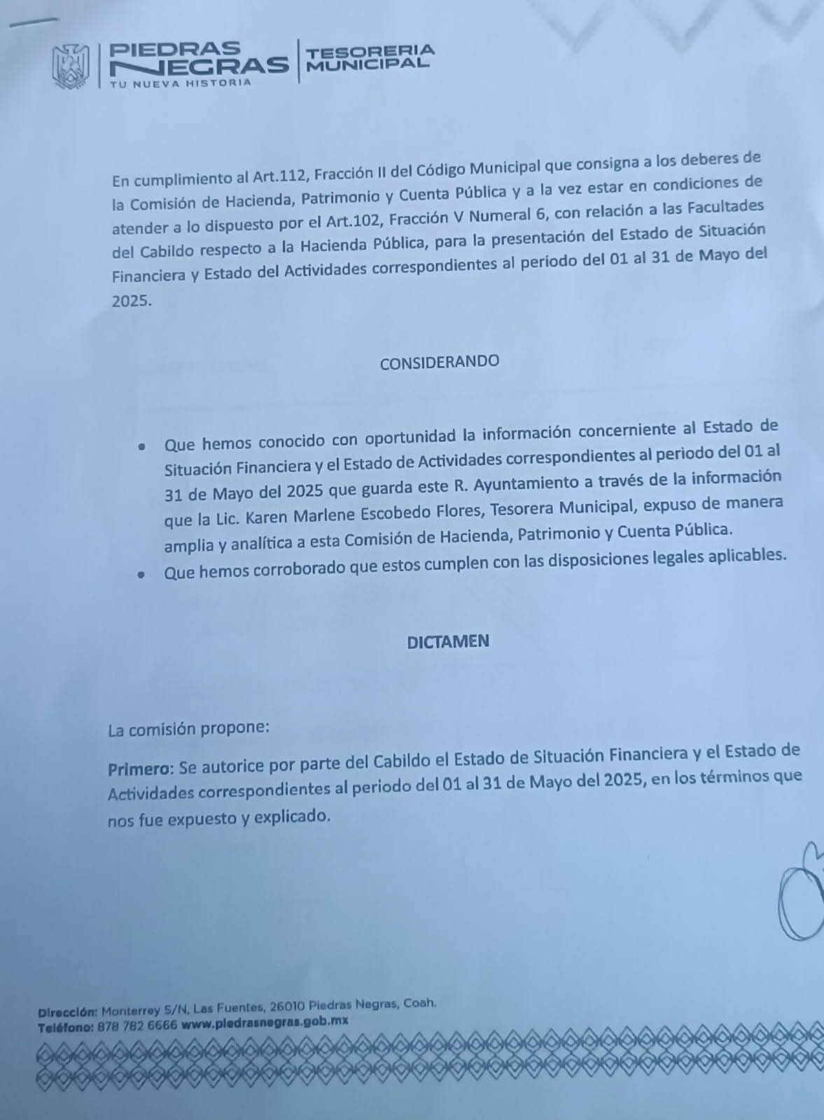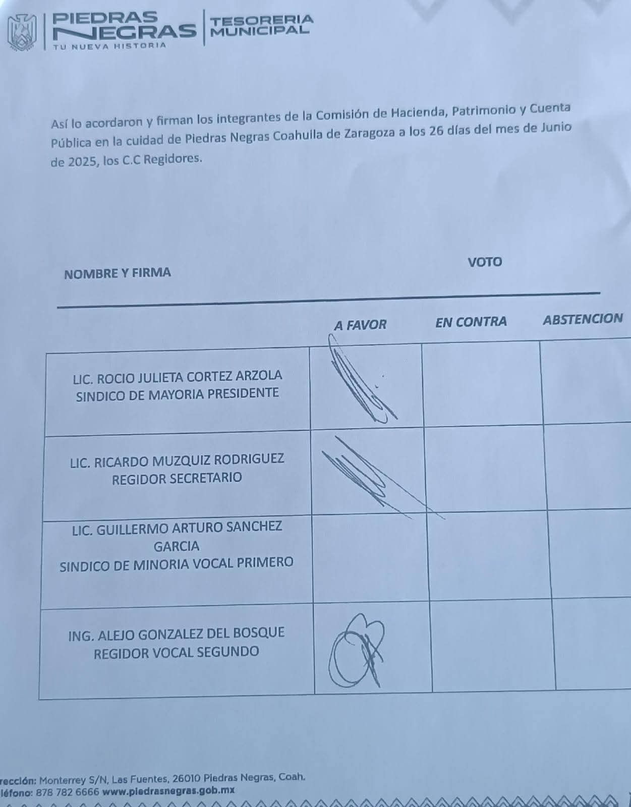 La Comisión de Hacienda, Patrimonio y Cuenta Pública del Ayuntamiento de Piedras Negras recibió y firmó el dictamen correspondiente a la cuenta pública del mes de mayo. Sin embargo, la votación no concuerda con lo expresado en semanas pasadas, particularmente por el cambio de postura del primer regidor Ricardo Múzquiz, quien anteriormente había sido uno de los principales críticos del alcalde Jacobo Rodríguez por el elevado gasto ejercido en la Feria del Norte.