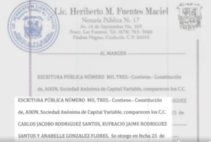 Al realizar una compra en la supuesta concretera, se entregó un recibo a nombre de Aikin S.A. de C.V., y personal de Arcco instruyó recoger la factura en la agencia Ford de Piedras Negras, negocio propiedad de la familia del alcalde. El acta constitutiva de Aikin confirma como socios a Carlos Jacobo Rodríguez Santos (padre del edil), Anabel González Flores (madre) y Eufracio Rodríguez Santos (tío). Según el reportaje, Arcco funciona como fachada para que Aikin facture la proveeduría de obras financiadas con recursos federales.