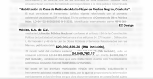 La obra del asilo fue adjudicada de manera formal a EC Design México S.A. de C.V., mediante contratos por casi 30 millones y una ampliación superior a 4 millones. A ello se suman otros dos contratos: uno por 5.5 millones para una línea de agua en El Cenizo y otro por 5.9 millones para una plaza en San Ramón. EC Design está registrada a nombre de Edgar Cárdenas Peña, concuño de Efren Rodríguez González, hermano del alcalde, cerrando el mecanismo de dispersión familiar descrito en el reportaje.