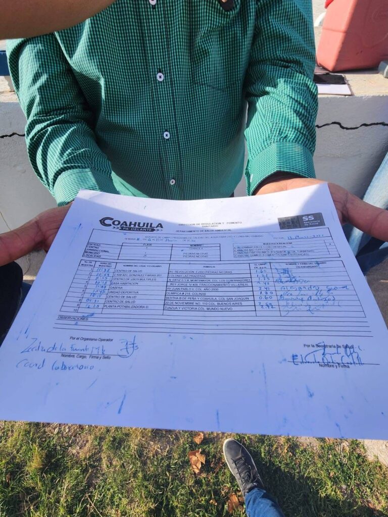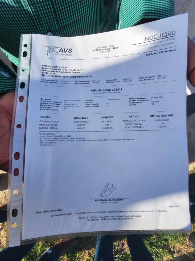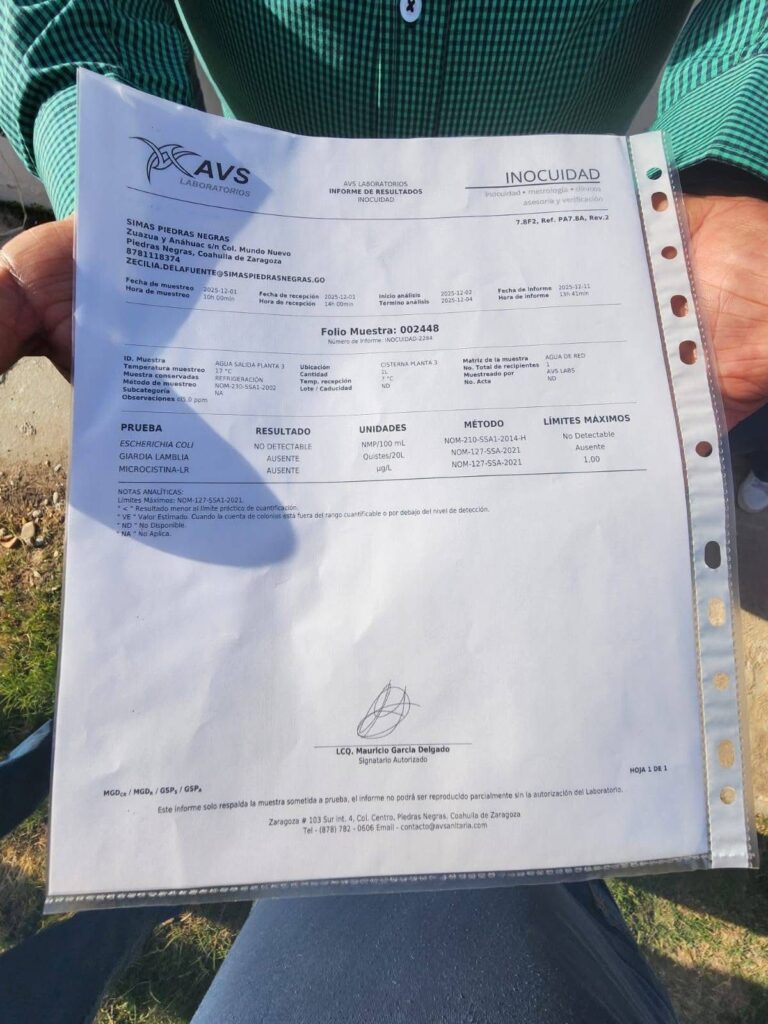 Por su parte, el gerente de SIMAS, Lorenzo Menera, citó a medios para demostrar que el agua que realmente llega a los domicilios es segura. Explicó que se realizarán pruebas con Laboratorios Valdez, único laboratorio certificado en Piedras Negras, y aclaró que “la cisterna que tomamos para la prueba es la que llega a la ciudad, no el agua que viene directo del río, que todavía no está filtrada ni clorada”. Durante la demostración, especialistas verificaron los niveles de cloro dentro de la norma, confirmando que el suministro domiciliario no representa riesgo para la salud.