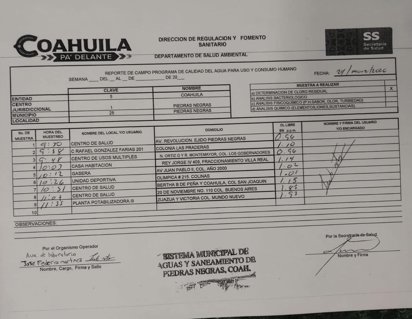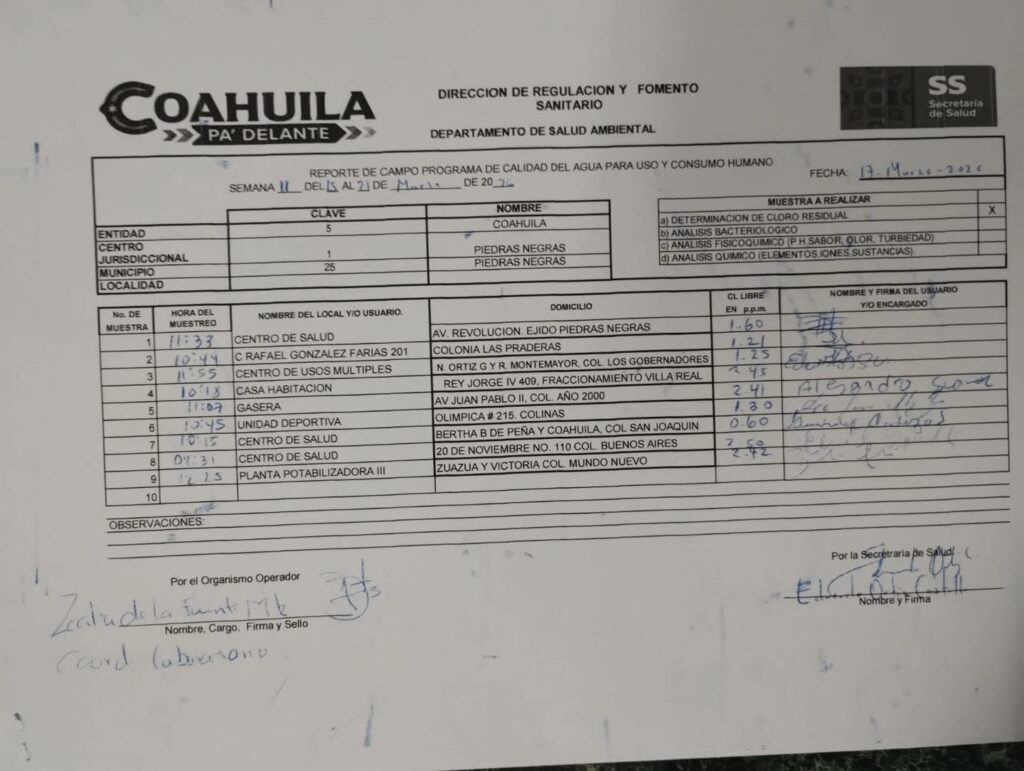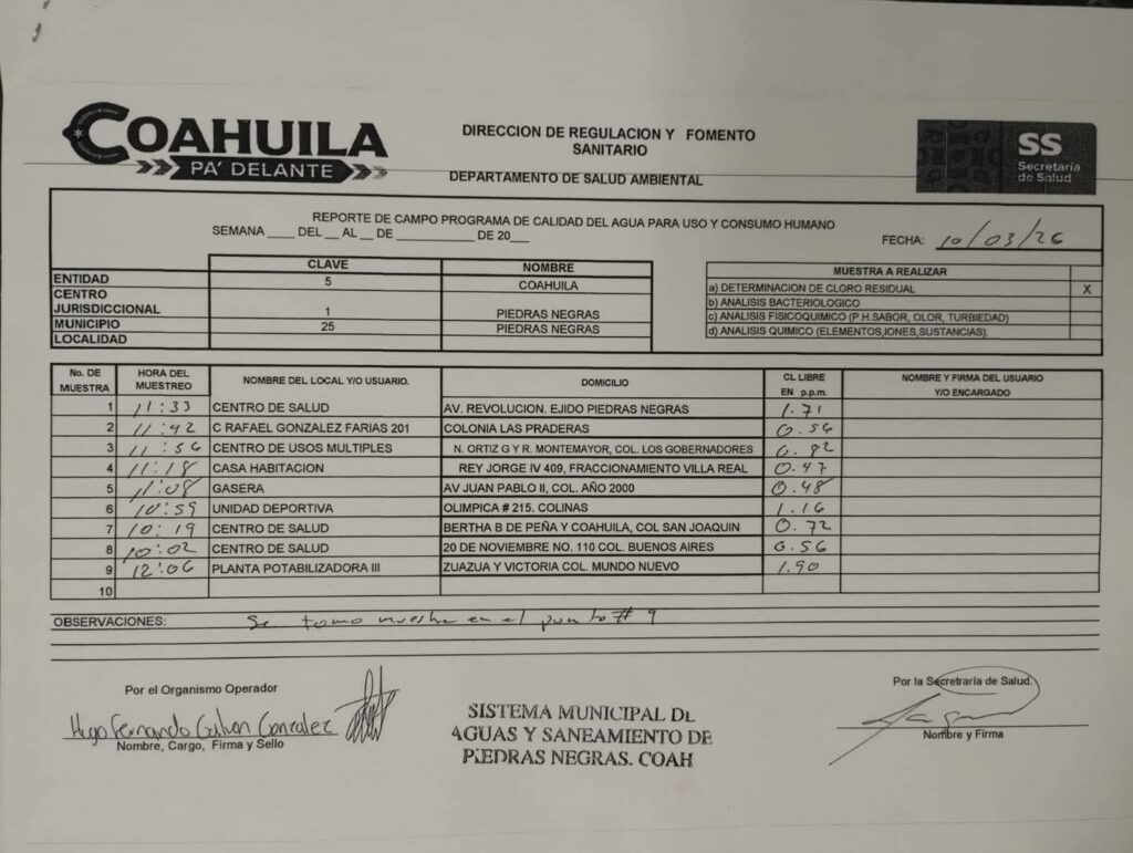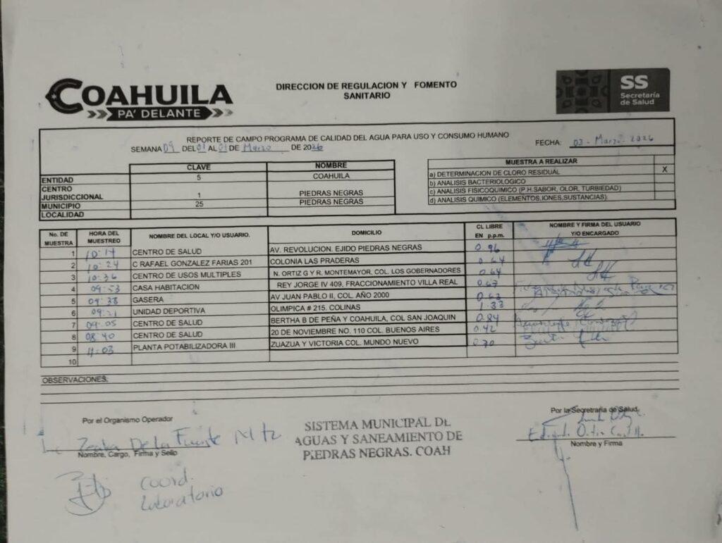La Secretaría de Salud, a través de la Dirección de Regulación y Fomento Sanitario y su Departamento de Salud Ambiental, confirmó que el agua distribuida por el Sistema Municipal de Aguas y Saneamiento (SIMAS) de Piedras Negras se encuentra dentro de los parámetros establecidos por la normatividad vigente.