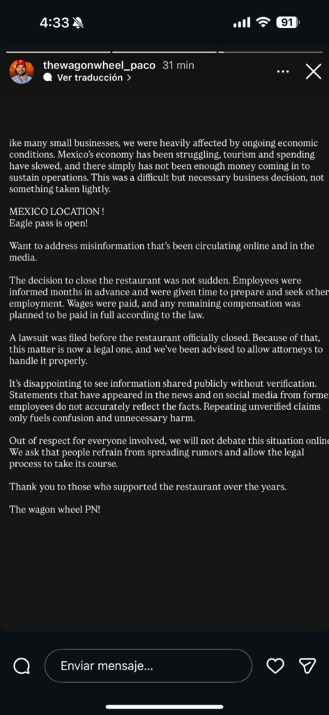 El restaurante The Wagon Wheel confirmó el cierre definitivo de su sucursal en Piedras Negras, argumentando una mala situación económica, derivada de la desaceleración del turismo y del gasto, así como de ingresos insuficientes para mantener la operación.
